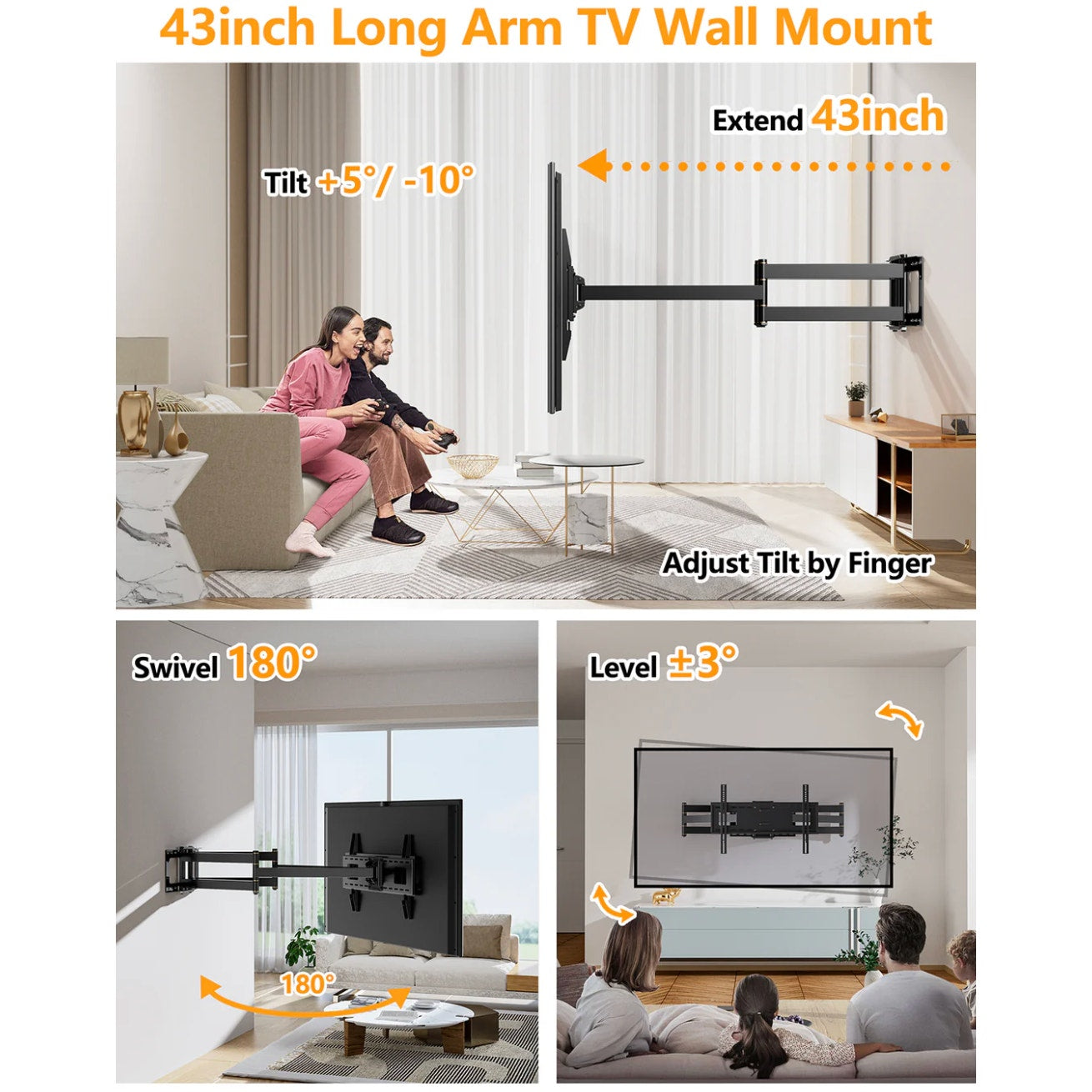 Full Motion Long-Arm TV Mount (43in arm) Fits 42–90" Flat/Curve TVs - Black
