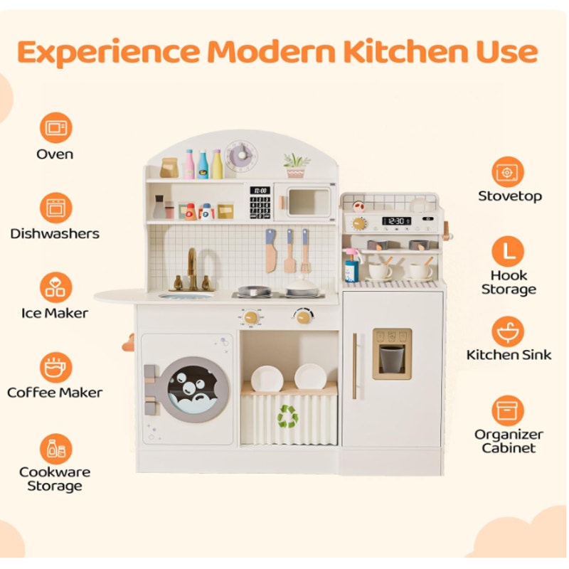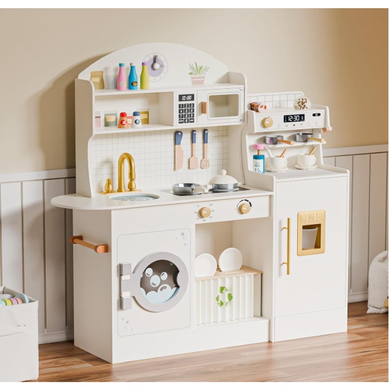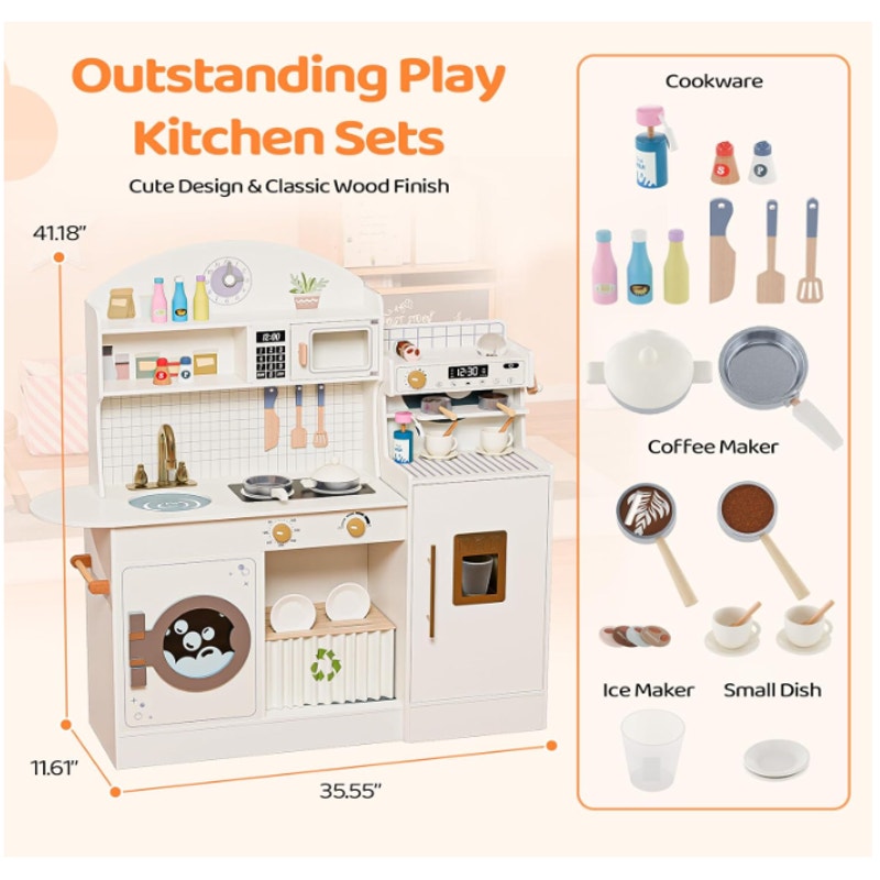 JOYMOR Wooden Play Kitchen w Pretend Kitchen Accessories, Cream/Gold 41"x35"x12"