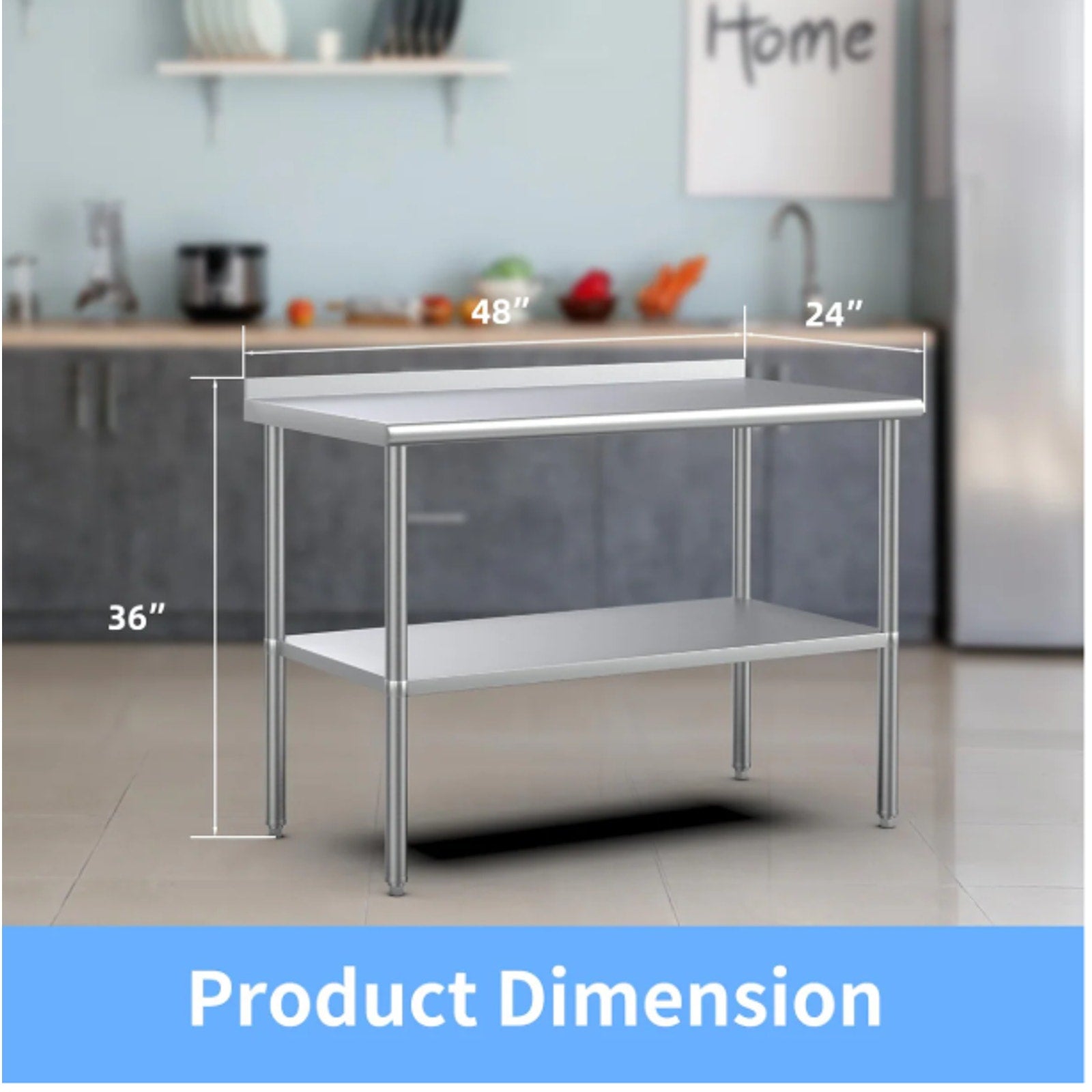 2. High Quality Material: Our prep table top, leg and undershelf are made of high quality stainless steel. Stainless steel and polished surface make the work table have higher rust and corrosion resistance. And the smooth surface can be easily cleaning with the rag or paper, the backslash effectively protects your walls from scratches and prevent water splashes.
