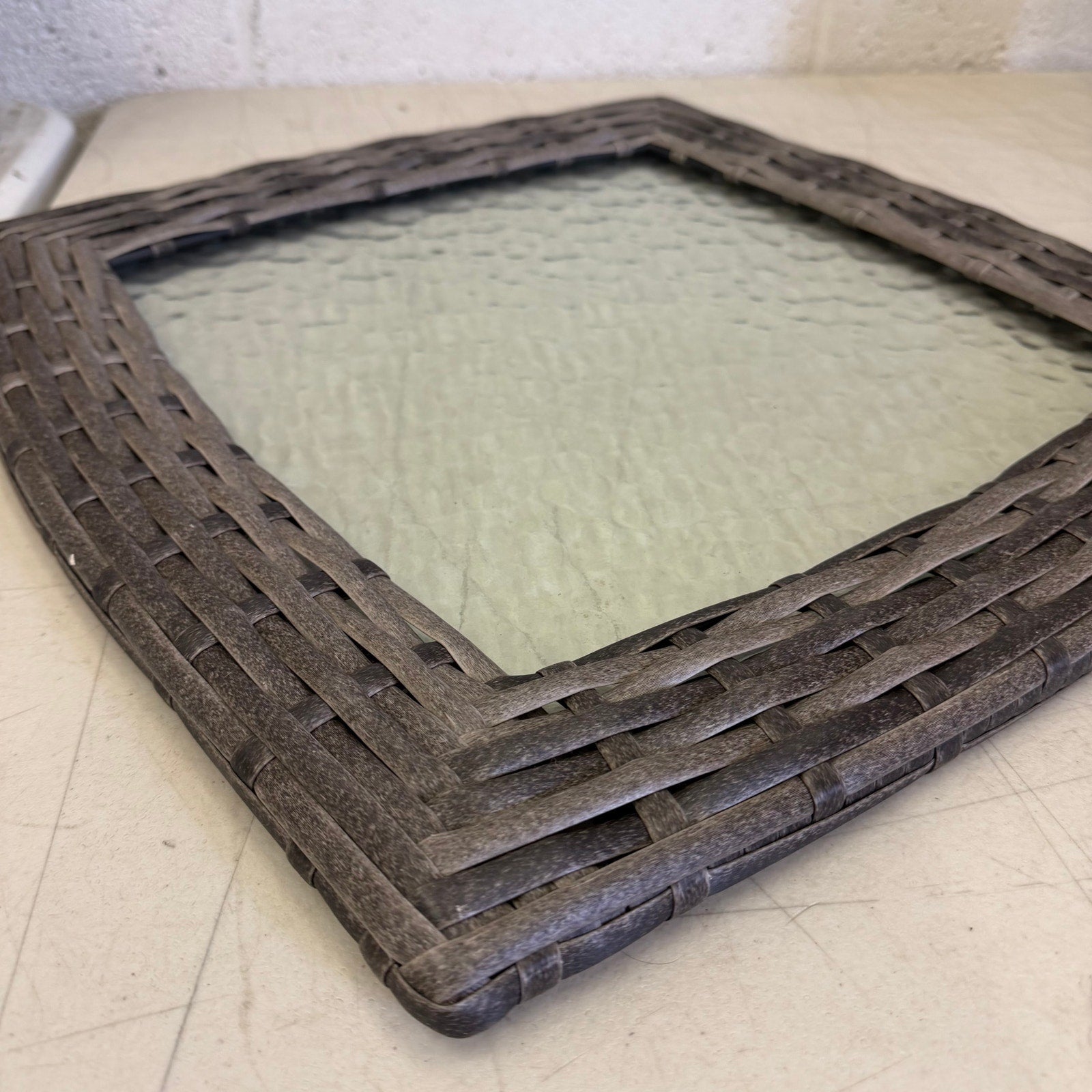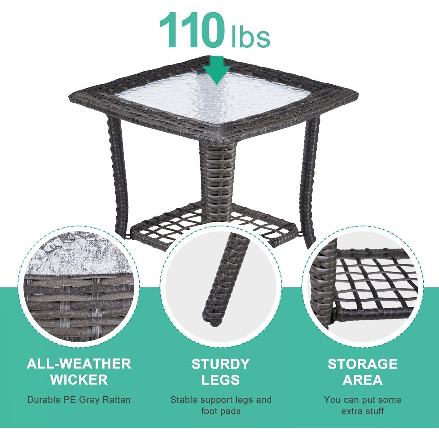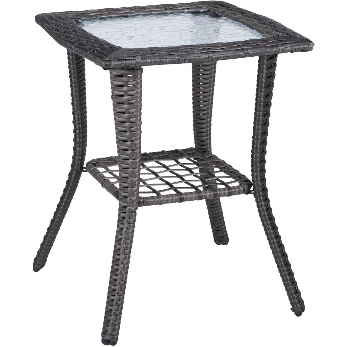 Square Wicker Outdoor Side Table with Tempered Glass Top & Iron Frame - Grey