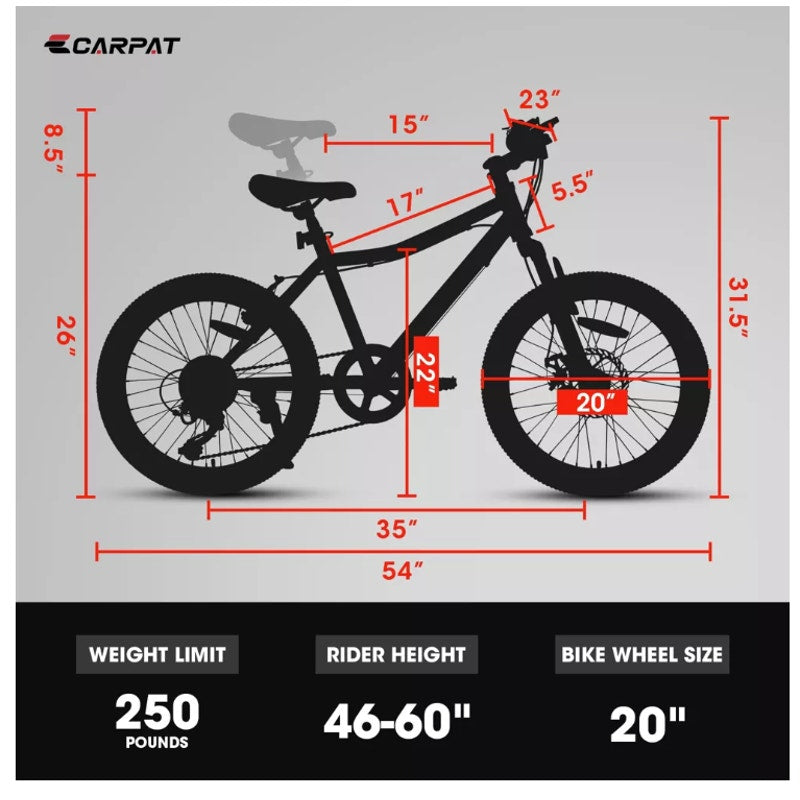 Whisen 20" Kids Mountain Bike 7 Speed Front Suspension Disc/V-Brake Steel Frame