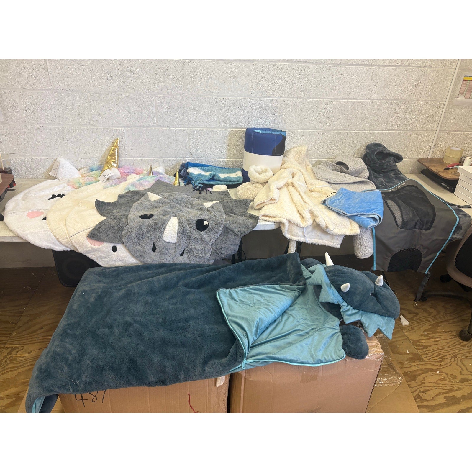 Lot-of-12 Soft Goods, Dino Sleeping Bag, 3 Unicorn Rug, 1 Dino Rug, Robe, 4 Blankets