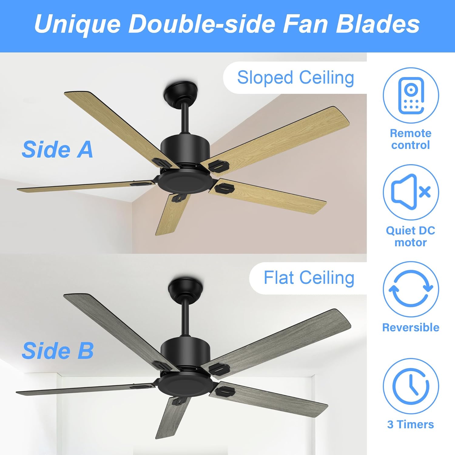 REVERSIBLE BLADE Ceiling Fan 52” 6 Speeds with Remote, Gray & Light Brown