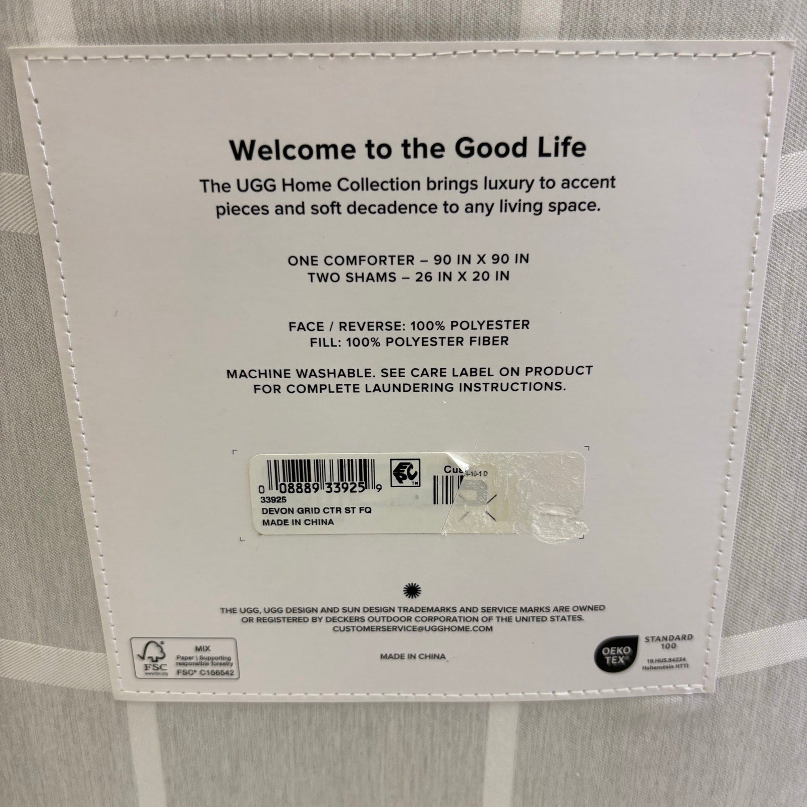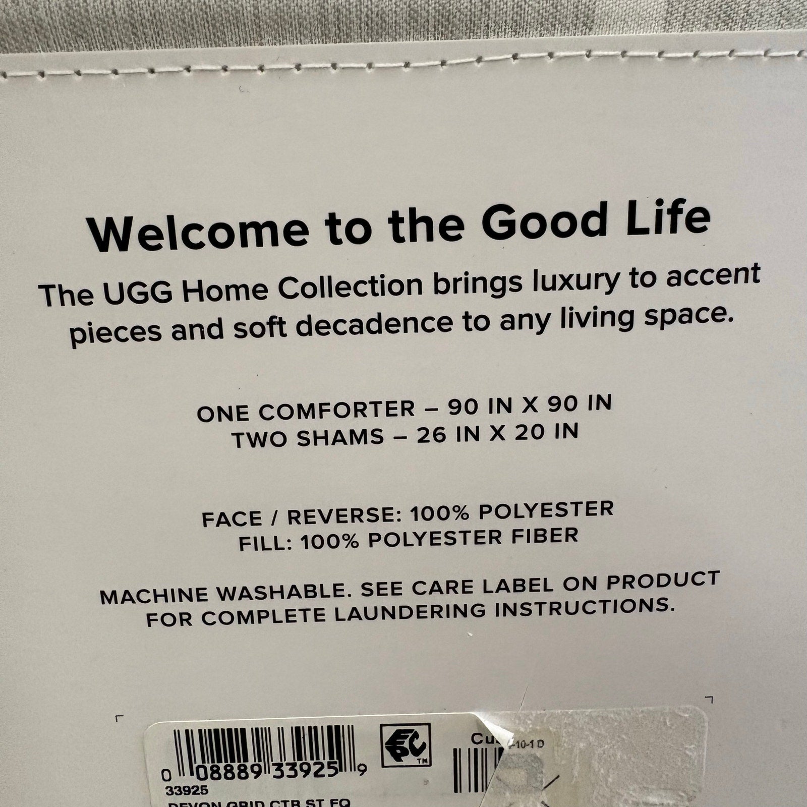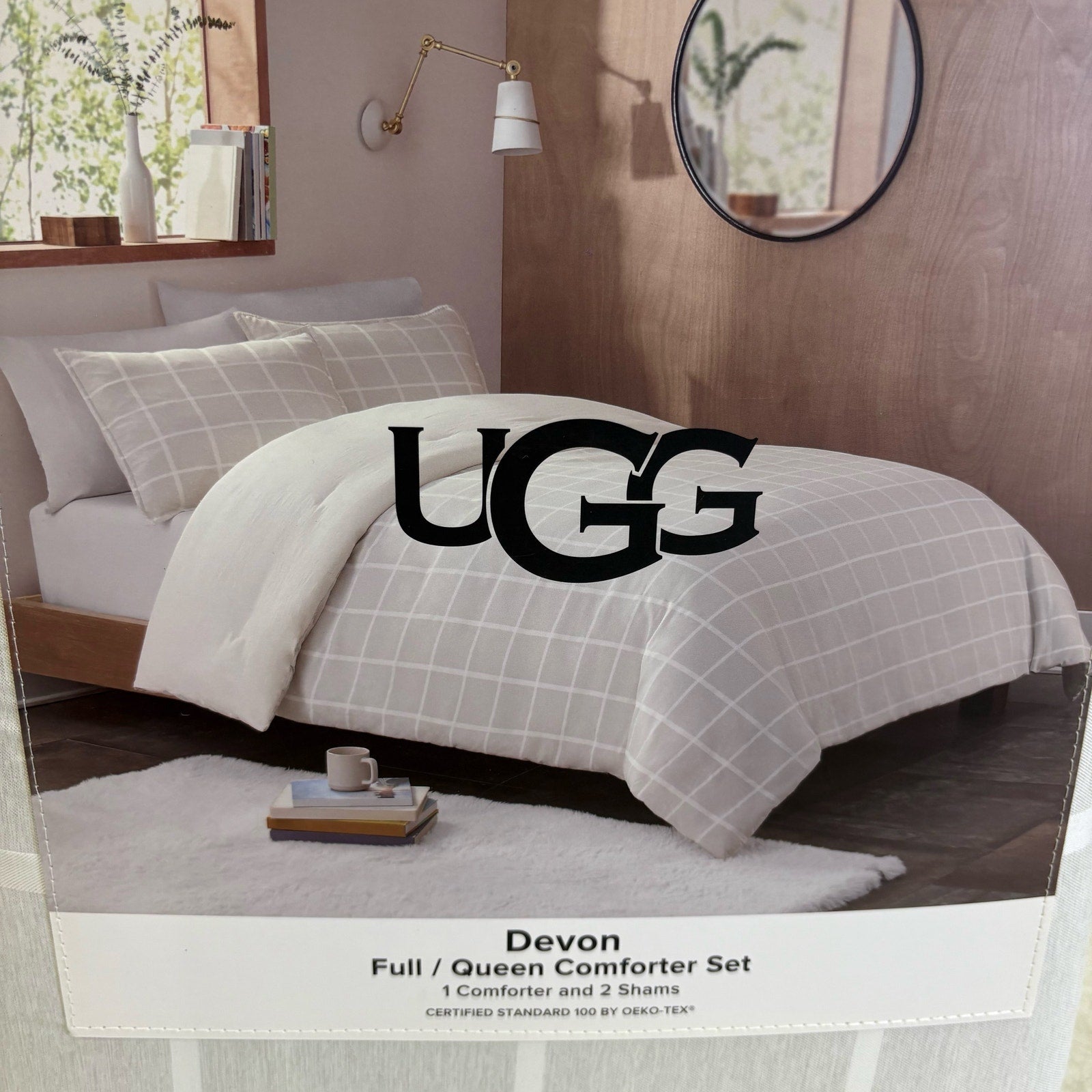 UGG Devon Queen Comforter Set w 2 Shams, Soft Bedding, Square Design - Gray
