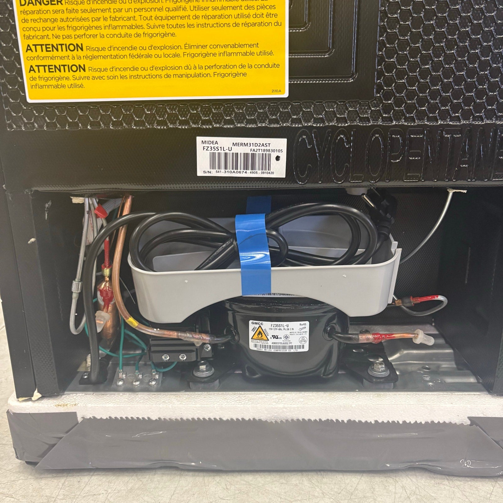 Whether you're college-bound or simply want a little extra refrigerator space in your home, office, or break room, Midea's 3.1 cu. ft. Stainless steel-look Single Door Mini Refrigerator offers the versatility you want with a minimalist design! A can dispenser conveniently located on the door makes beverages easy to access, while additional door shelves provide space for other frequently used items and a 2-liter sized bottle or carton. A clear pull-out crisper keeps food organized, and a separate freezer compartment provides storage for frozen items. Adjustable glass shelves