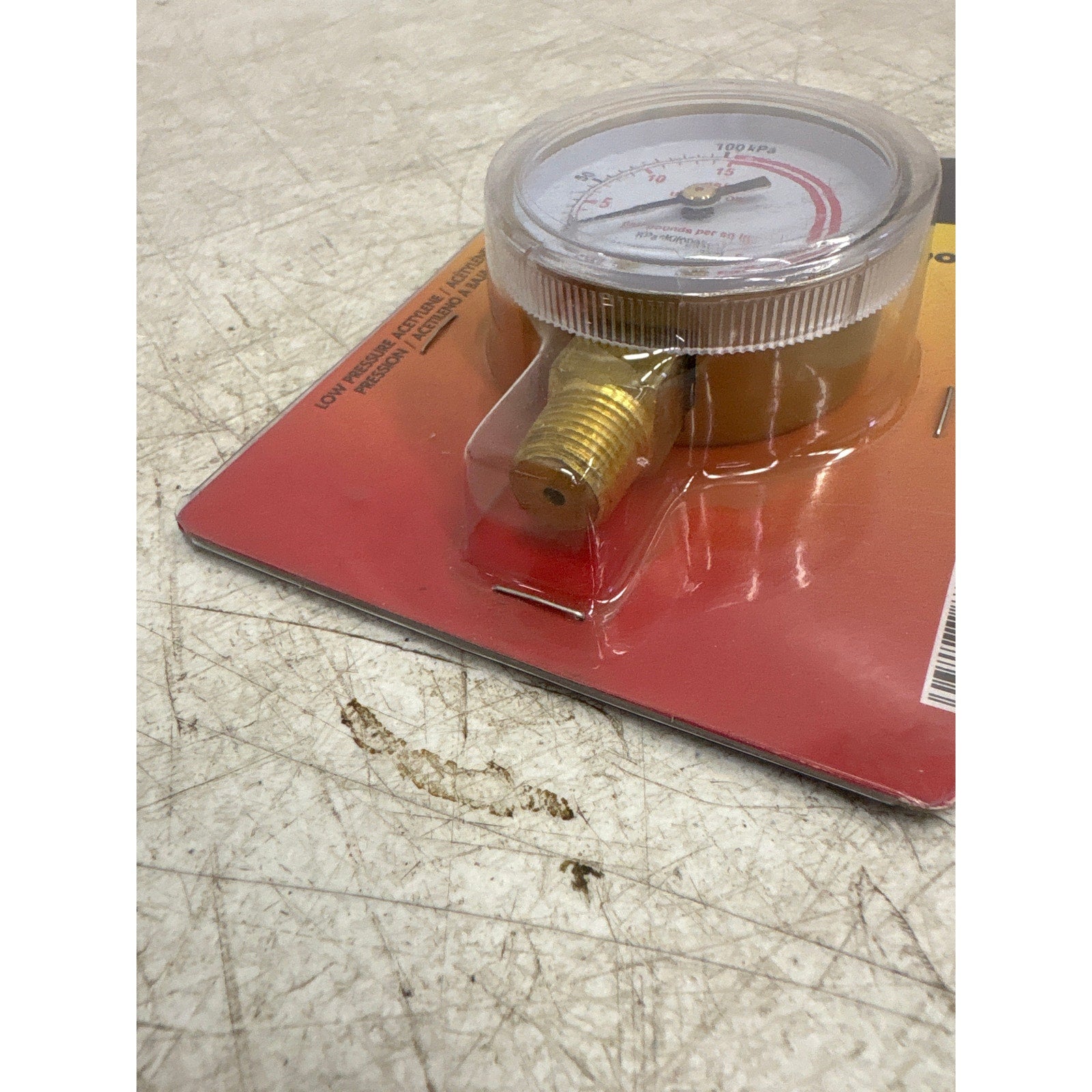 The low pressure regulator gauge, 0-30 PSI, is a versatile low-pressure gauge designed for use with various regulators. It features a 2-inch (50.8 mm) face that provides clear readability of pressure measurements ranging from 0 to 30 PSIG. The gauge is equipped with a 1/4-inch (6.35 mm) national pipe thread (NPT) connection, making it compatible with most standard regulators. This universal design allows for easy installation and replacement across a wide range of applications, including welding equipment, gas systems, and pressure monitoring devices. The gauge's low-pressure range makes it ideal for precise control in applications requiring fine pressure adjustments.