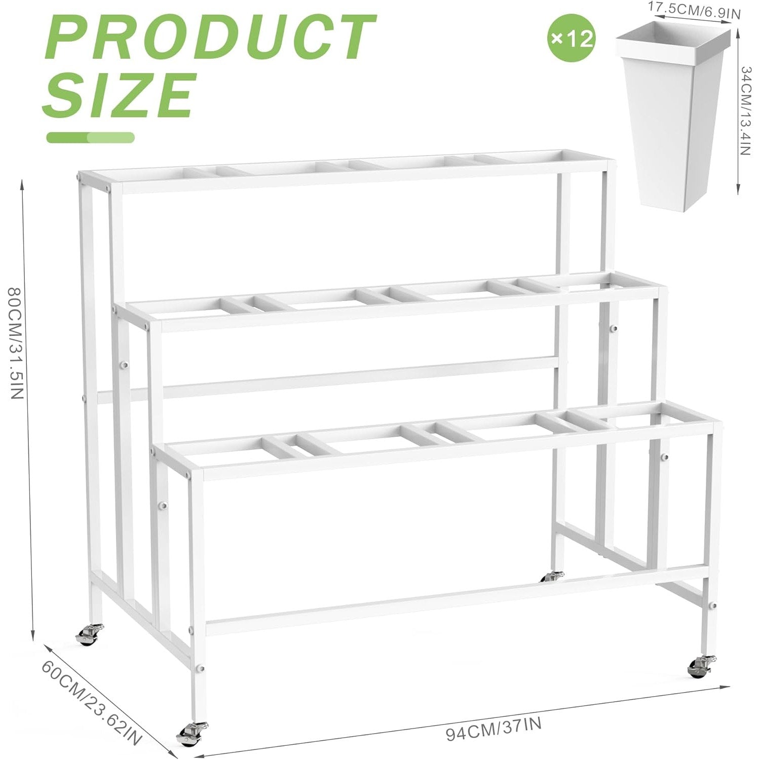 VGMiu 3-Tier Metal Flower Stand with 12 Buckets, Wheels & Brakes, White, Damaged