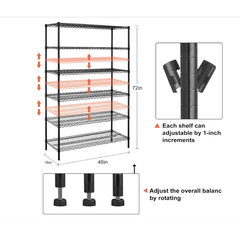 ADJUSTABLE SHELVING: 6-tier heavy duty metal shelving unit can be adjusted by 1-inch increments, you can adjust height between 2 shelves as your need