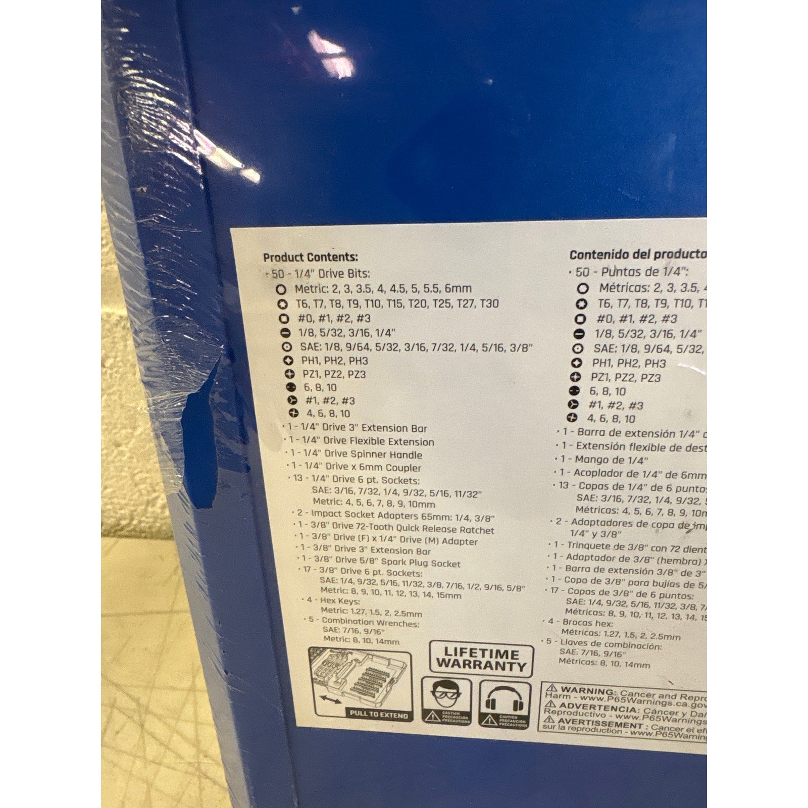 Contents: 50 - 1/4" Drive Bits: Metric: 2, 3, 3.5, 4, 4.5, 5, 5.5, 6mm, T6, T7, T8, T9, T10, T15, T20, T25, T27, T30, #0, #1, #2, #3, 1/8, 5/32, 3/16, 1/4", SAE: 1/8, 9/64, 5/32, 3/16, 7/32, 1/4, 5/16, 3/8"; PH1, PH2, PH3, PZ1, PZ2, PZ3, 6, 8, 10, No. 1, No. 2,No. 3, 4, 6, 8, 10, 1 - 1/4" Drive 3" Extension Bar, 1 - 1/4" Drive Flexible Extension, 1 - 1/4" Drive Spinner Handle, 1 - 1/4" Drive x 6mm Coupler; 13 - 1/4" Drive 6 pt. Sockets: SAE: 3/16, 7/32, 1/4, 9/32, 5/16, 11/32", Metric: 4, 5, 6, 7, 8, 9, 10mm, 2 - Impact Socket Adapters 65mm: 1/4, 3/8", 1 - 3/8" Drive 72-Tooth Quick Release Ratchet, 1 - 3/8" Drive (F) x 1/4" Drive (M) Adapter; 1 - 3/8" Drive 3" Extension Bar, 1 - 3/8" Drive 5/8" Spark Plug Socket, 17 - 3/8" Drive 6 pt. Sockets: SAE: 1/4, 9/32, 5/16, 11/32, 3/8, 7/16, 1/2, 9/16, 5/8" Metric: 8, 9, 10, 11, 12, 13, 14, 15mm; 4 - Hex Keys: Metric: 1.27, 1.5, 2, 2.5mm, 5 - Wrenches: SAE: 7/16, 9/16", Metric: 8, 10, 14mm