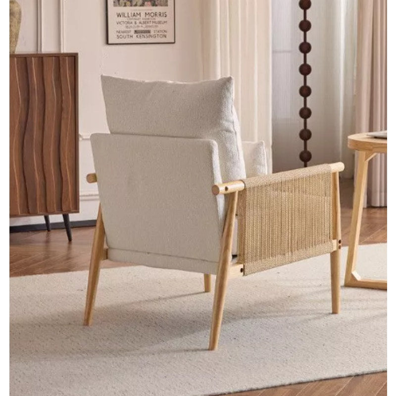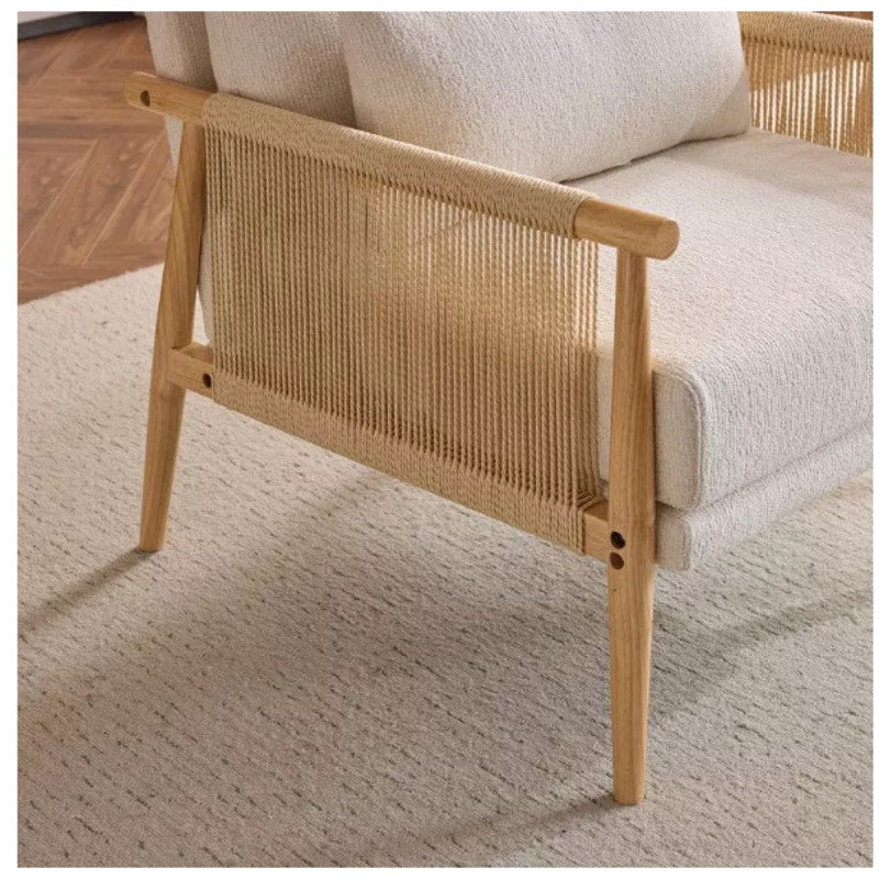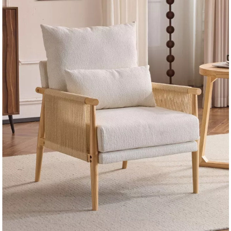Elevate your indoor relaxation with this beautifully crafted accent chair, designed to combine natural elegance and modern comfort. The chair features a solid wood frame in a warm, natural wood finish, offering durability and a timeless aesthetic. Its unique handwoven rope armrests add a touch of artisanal charm while ensuring lasting strength.