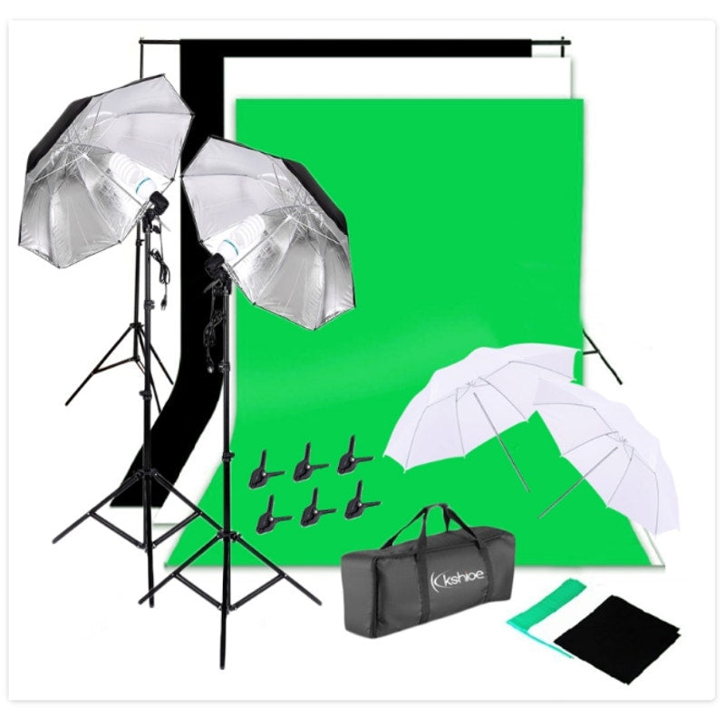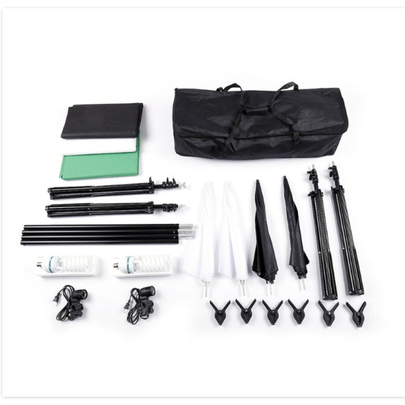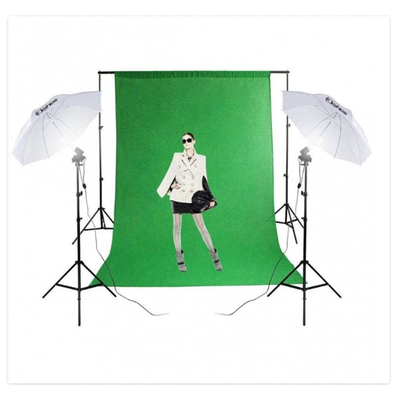 You are in the right place! With our 135W Silver Black Umbrellas with Background Stand Muslim Cloth (Black & White & Green) Set, you can do fashion shots, video filming when the studio space is limited, also can pack them all up as a travel set.