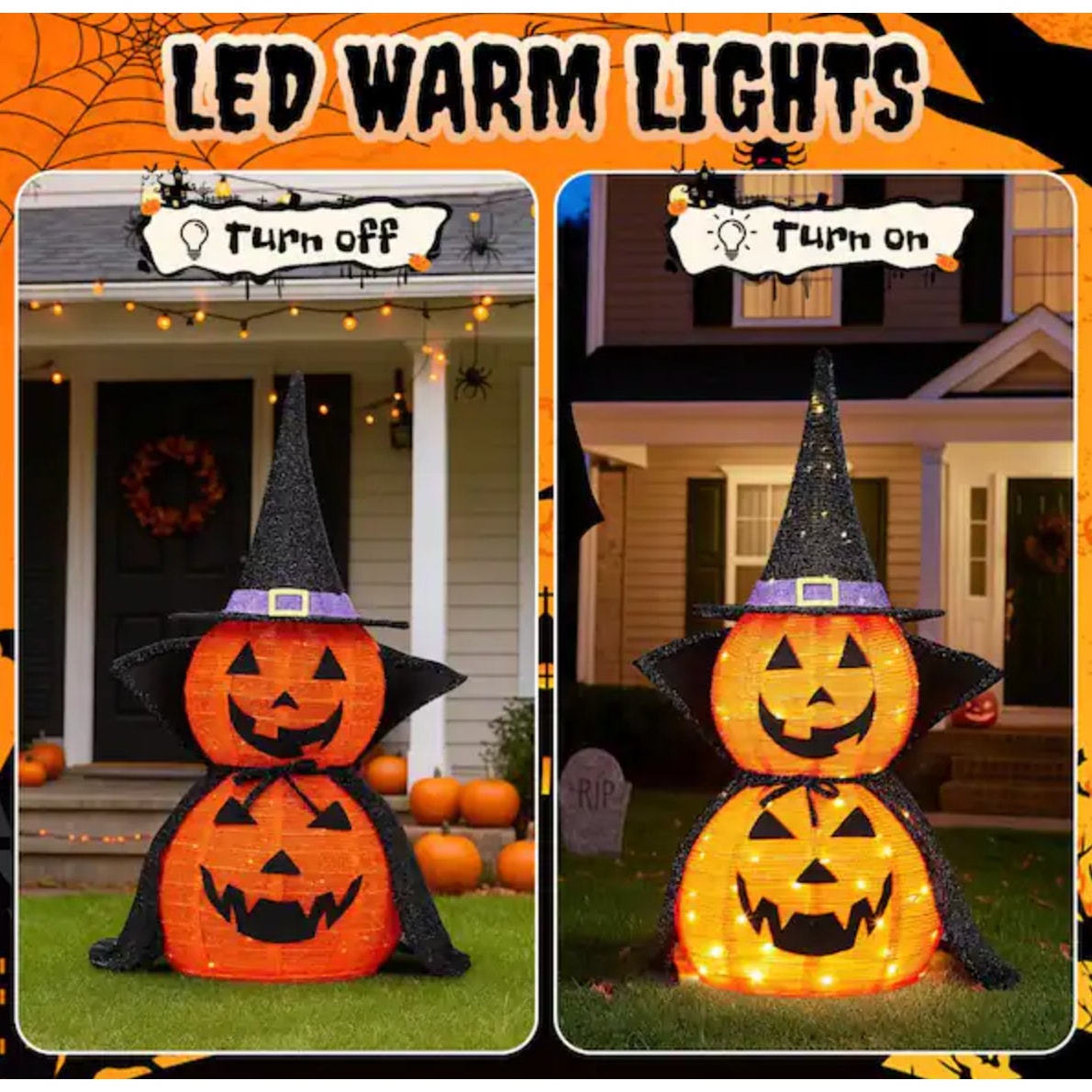 Brilliant 176 LED Lights: Each pumpkin is pre-installed with 176 warm LED lights that cast a festive glow, perfect for illuminating your yard, garden, or living room all Halloween night.