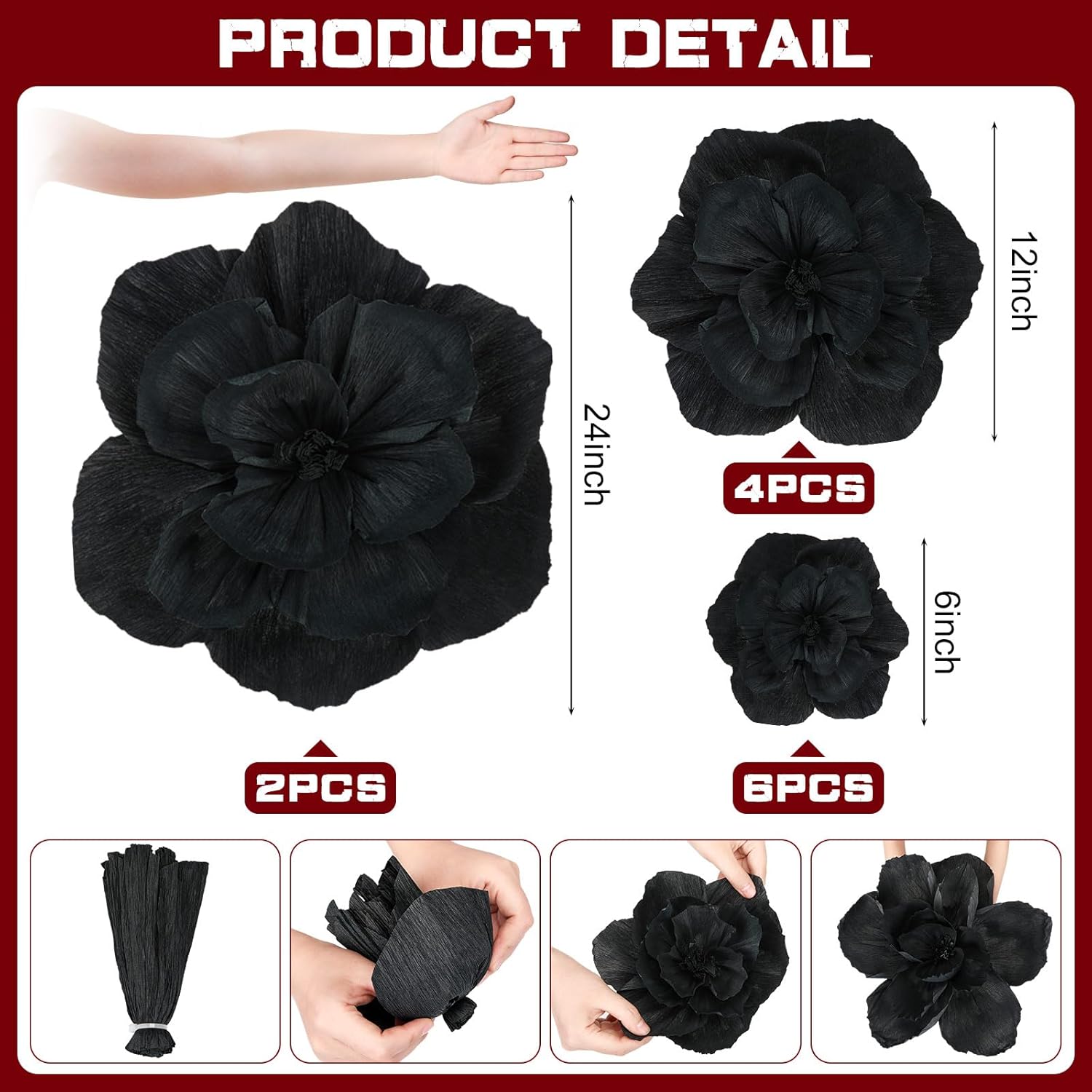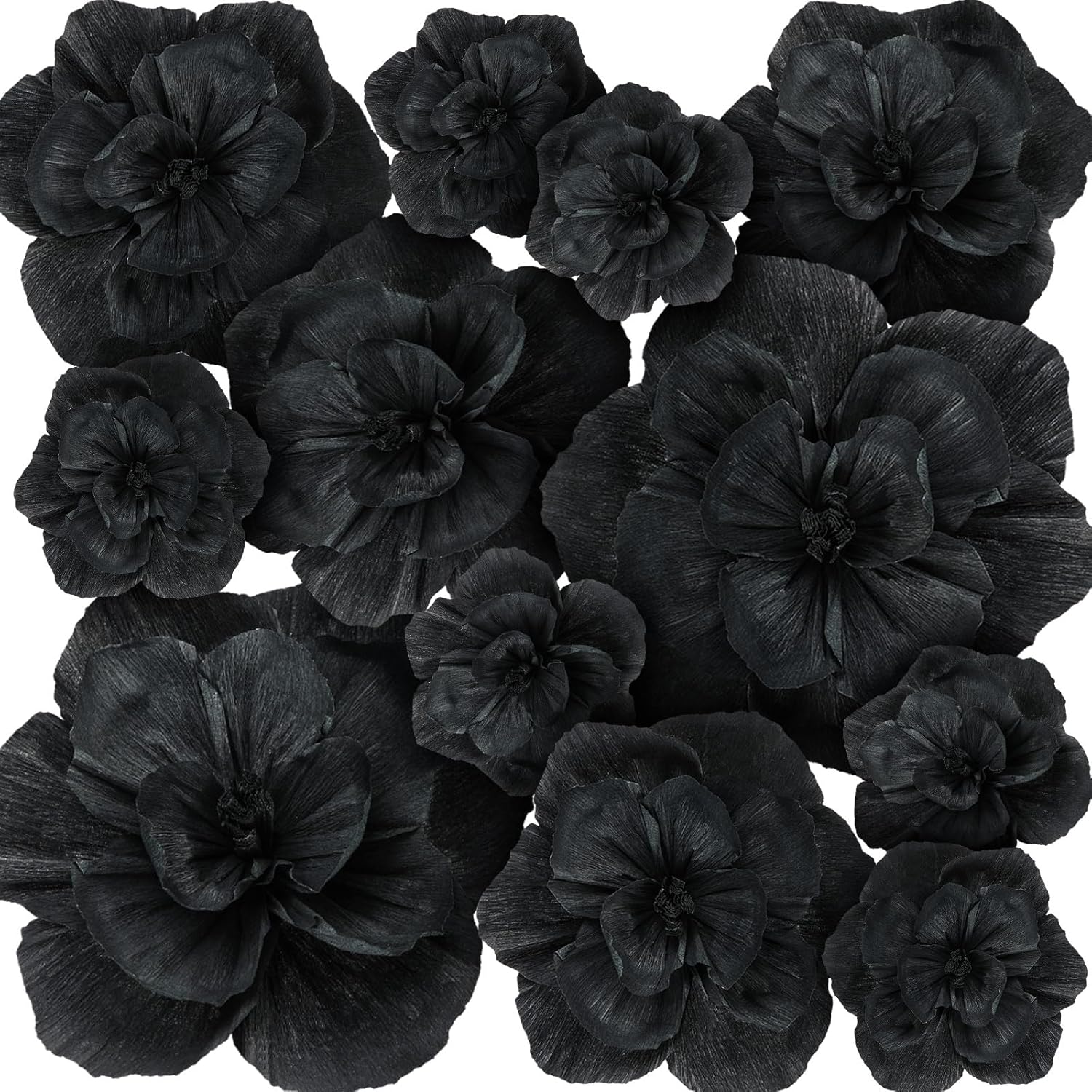 (12 pcs) Black Artificial Paper Flower Kit | 3-Sizes (24", 12", 6") Decorations