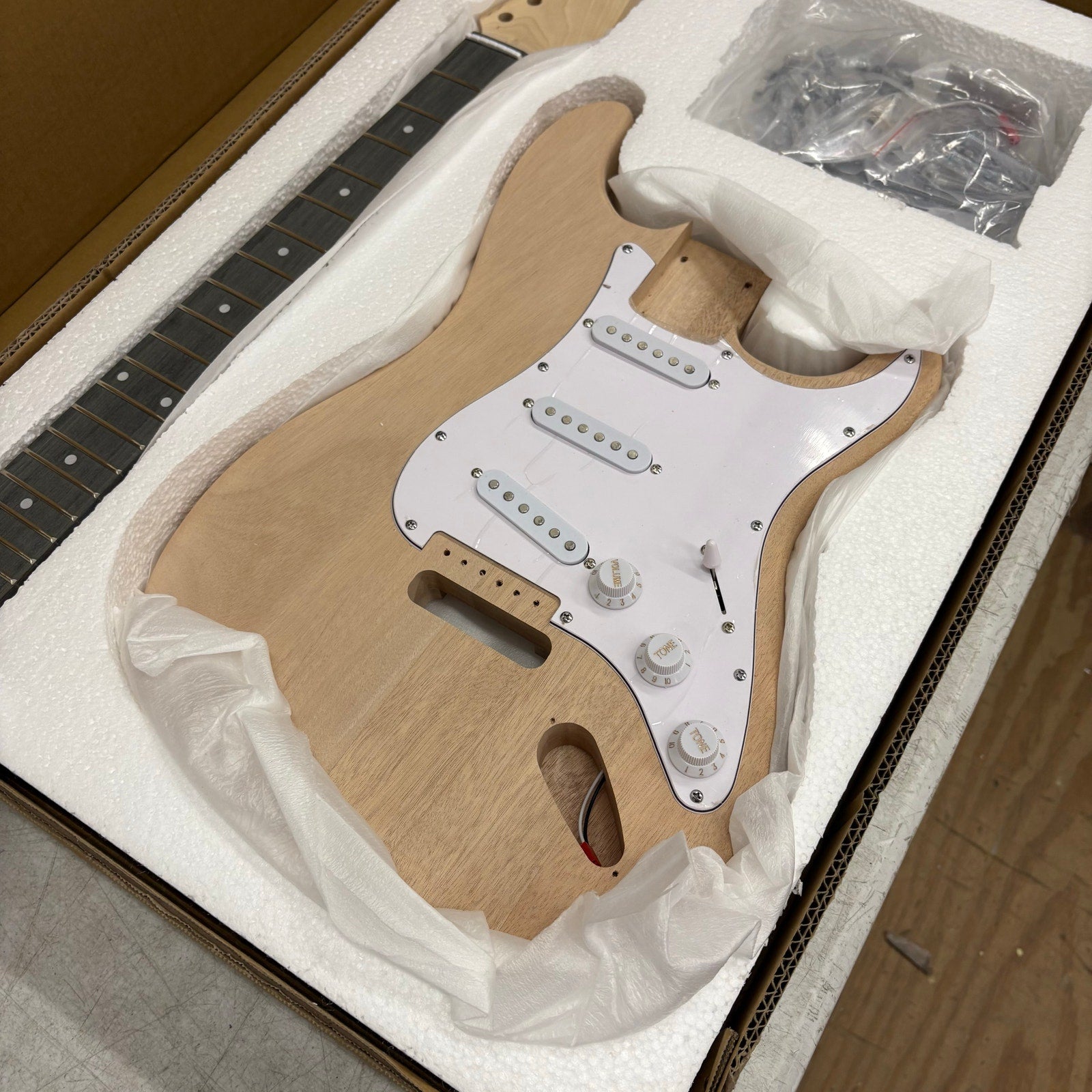 Each kit includes a guitar body, headstock, 6 strings, 6 tuning knobs, a bridge, assembly hardware, a strap, a cable, a tremolo arm, a wrench, and a pick, providing everything you need for a complete build.