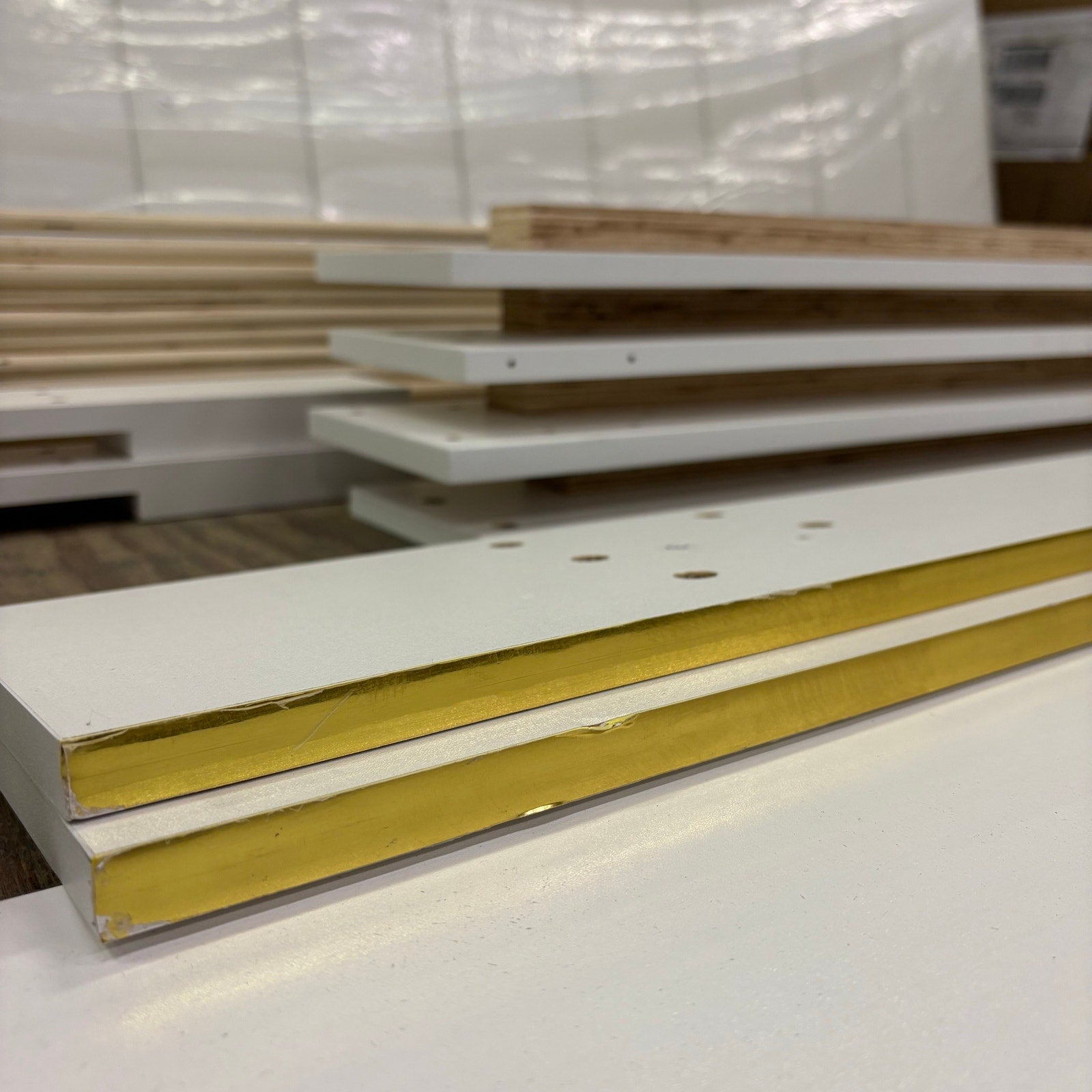 Queen Platform Bed with White Wood Frame, Upholstered Headboard, Gold Edged Panels