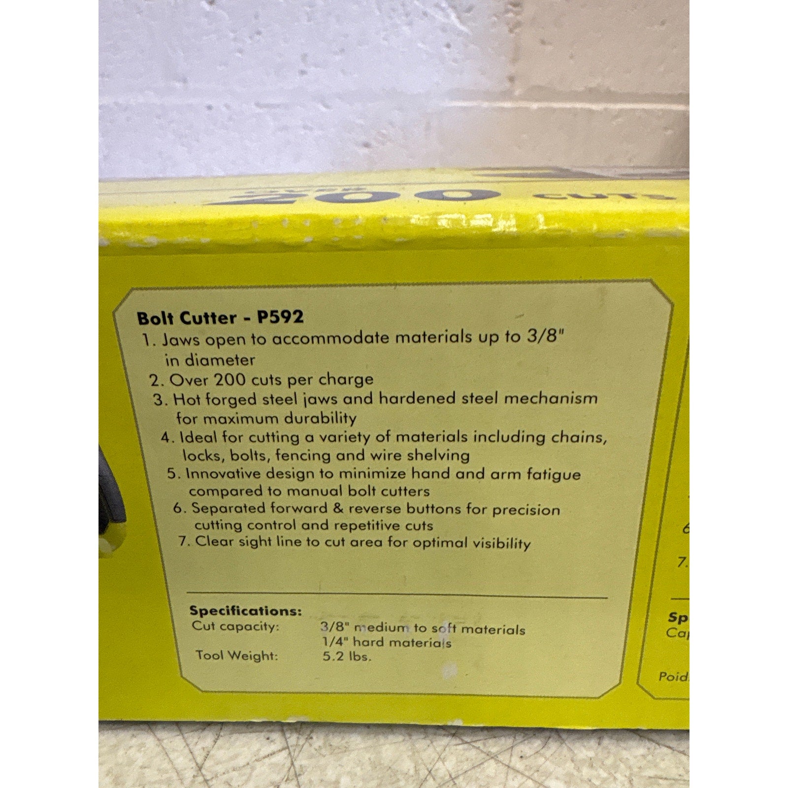 Expand your RYOBI ONE+ 18V tool collection with the ONE+ 18V Bolt Cutter. Hot forged steel jaws open to accommodate materials like chains, locks, bolts, fencing and wire shelving up to 3/8 in. in diameter, performing up to 200 cuts per charge using a RYOBI High Capacity LITHIUM+ battery. The innovative design minimizes hand and arm fatigue typically experienced with manual bolt cutters, and the clear sight line in the design allows for optimal visibility of the cut area. Additionally, this tool features separate forward and reverse buttons for precision cutting control and makes repetitive cuts easy. The RYOBI ONE+ 18V Bolt Cutter is backed by a 3-year warranty and is part of the RYOBI 18V ONE+ System of over 300 Cordless Products. The 18V ONE+ Bolt Cutter includes an operators manual and is sold as a tool only product. Battery and charger are sold separately.