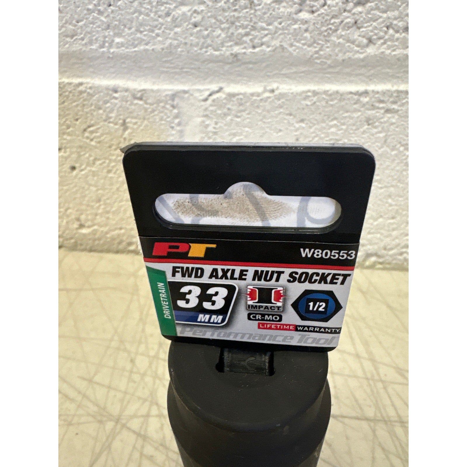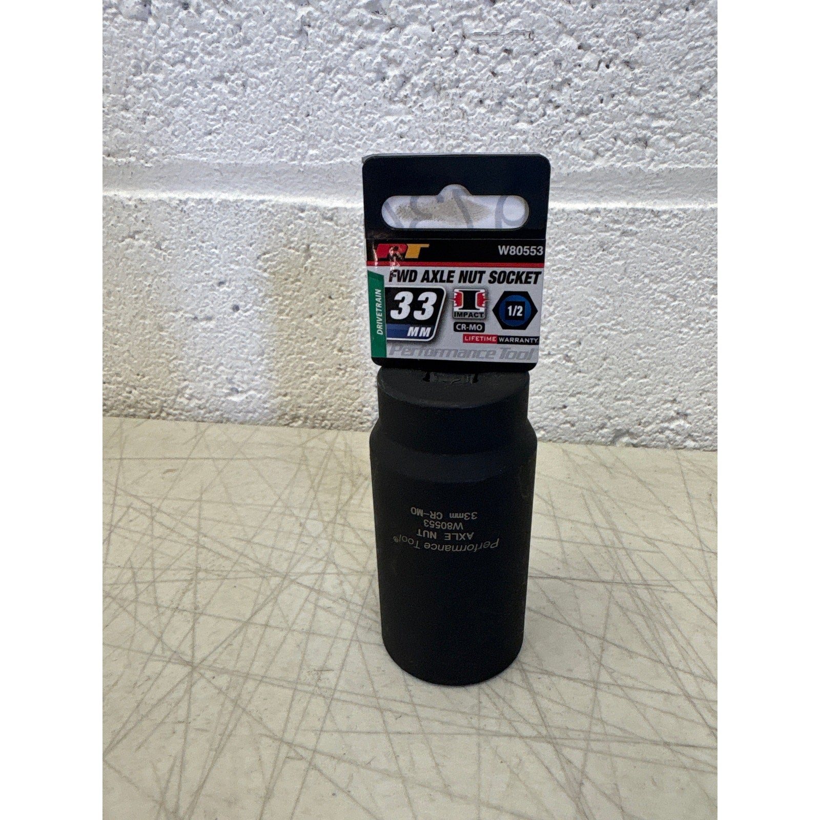 The Performance Tool W80553 33mm Front Wheel drive Axle Nut Socket for removal or installation of axle nuts on front wheel drive vehicles, made of heavy duty chrome moly alloy steel. fits many GM applications, as well as 33 Millimeter and many GM and Chrysler applications.