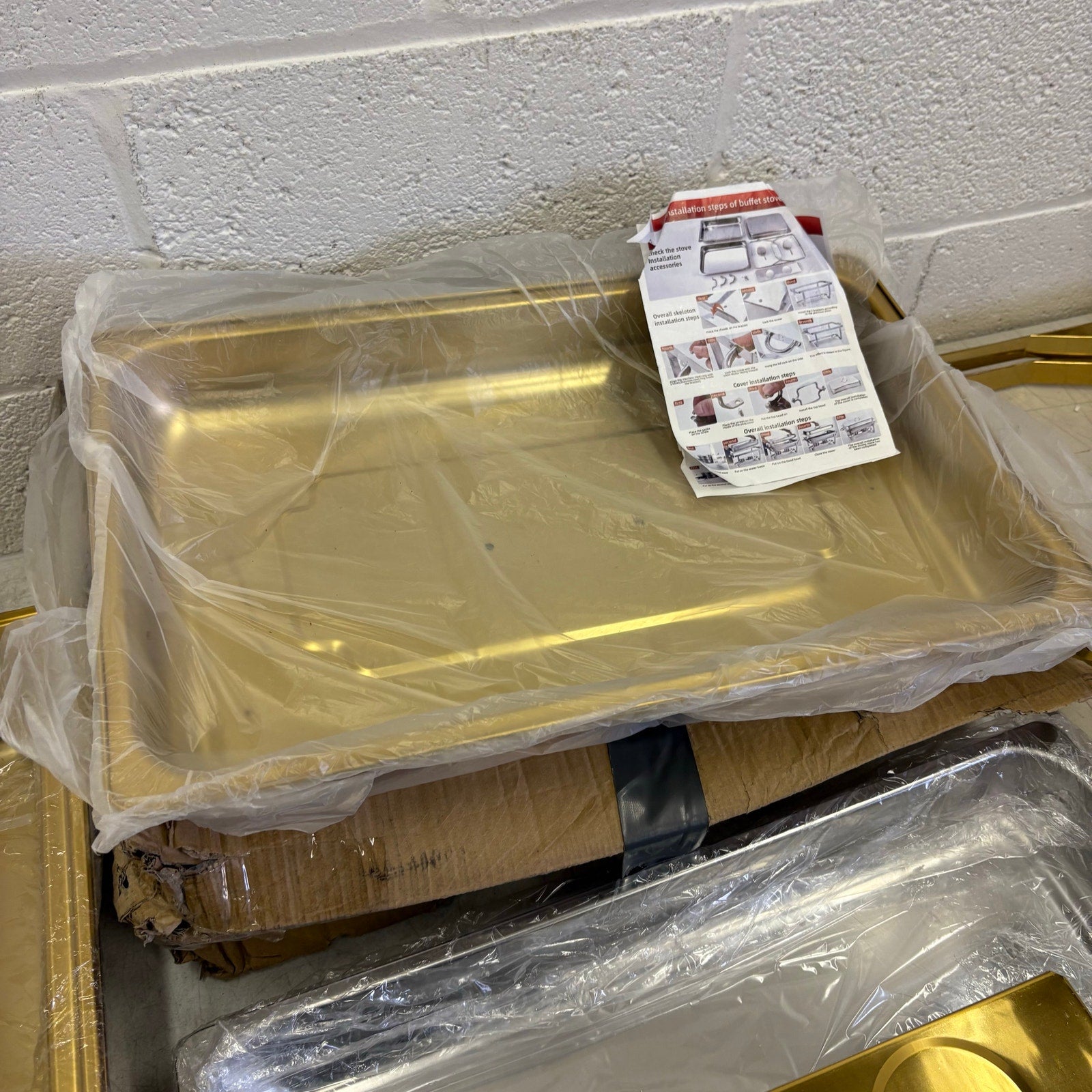 2. Gold Chafing Dishes: Features with gold & silver design create a textured metal sense,elegantly display catering food straight from the oven onto the buffet table. Perfect for restaurant or hotel commercial use.