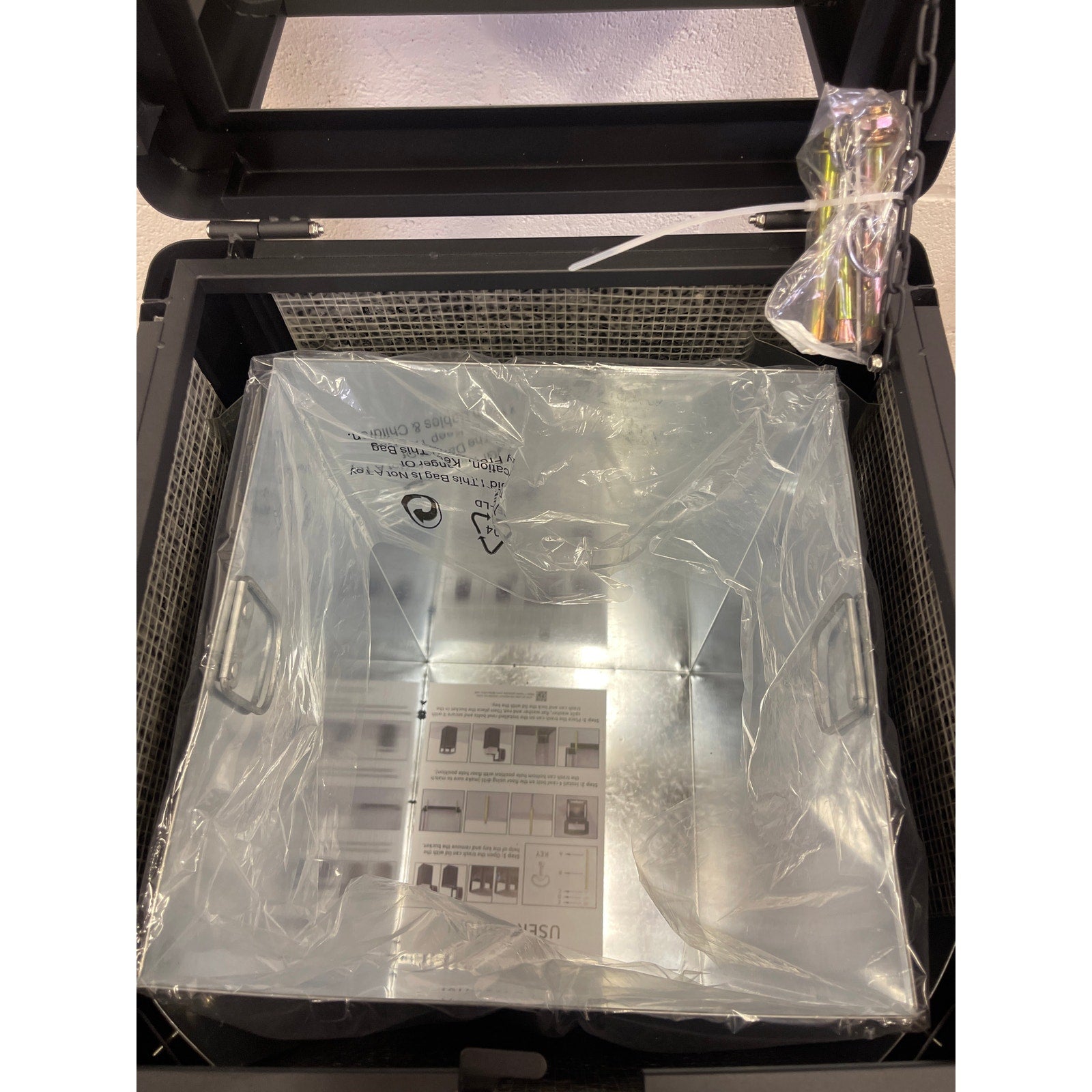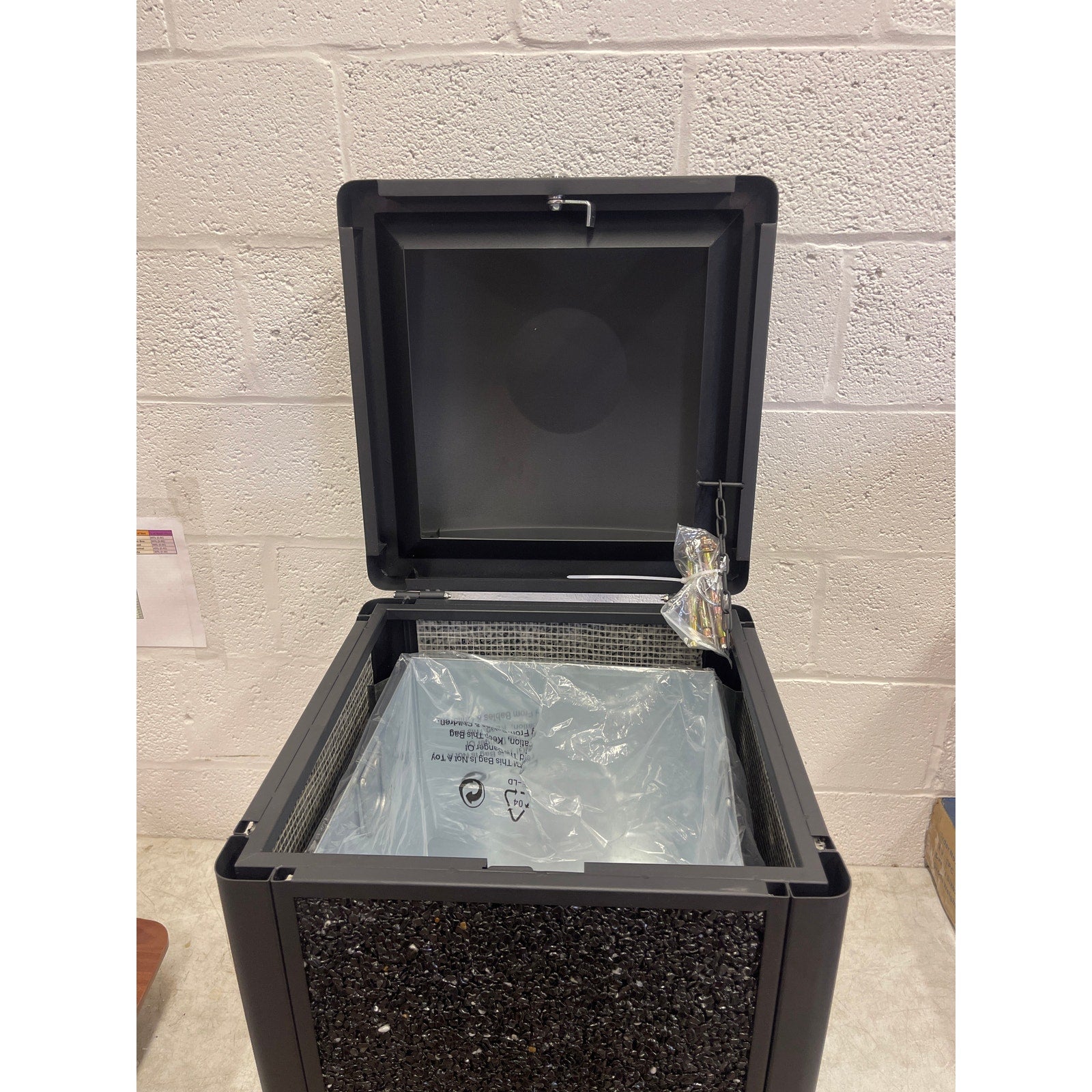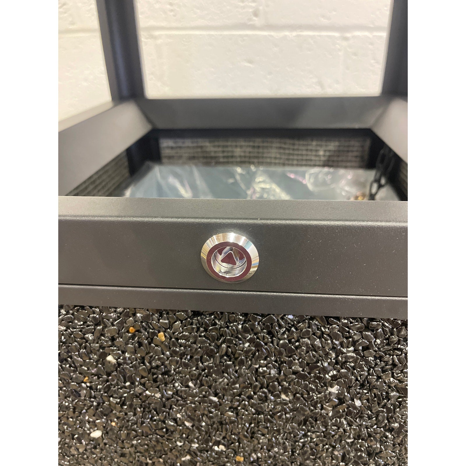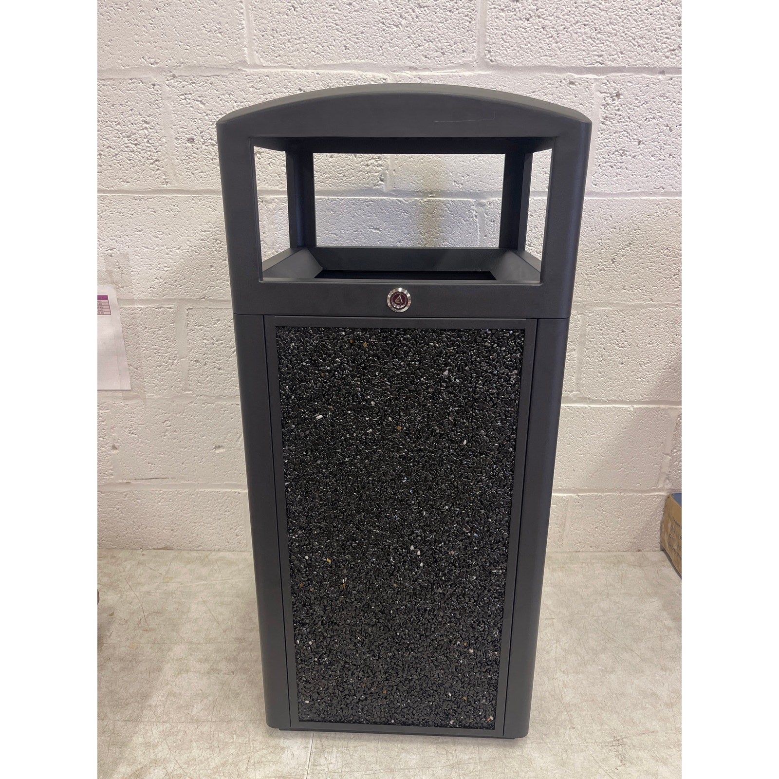 15-Gal Metal Outdoor Commercial Trash Can Bin Locking Lid, Stone Panels, Black