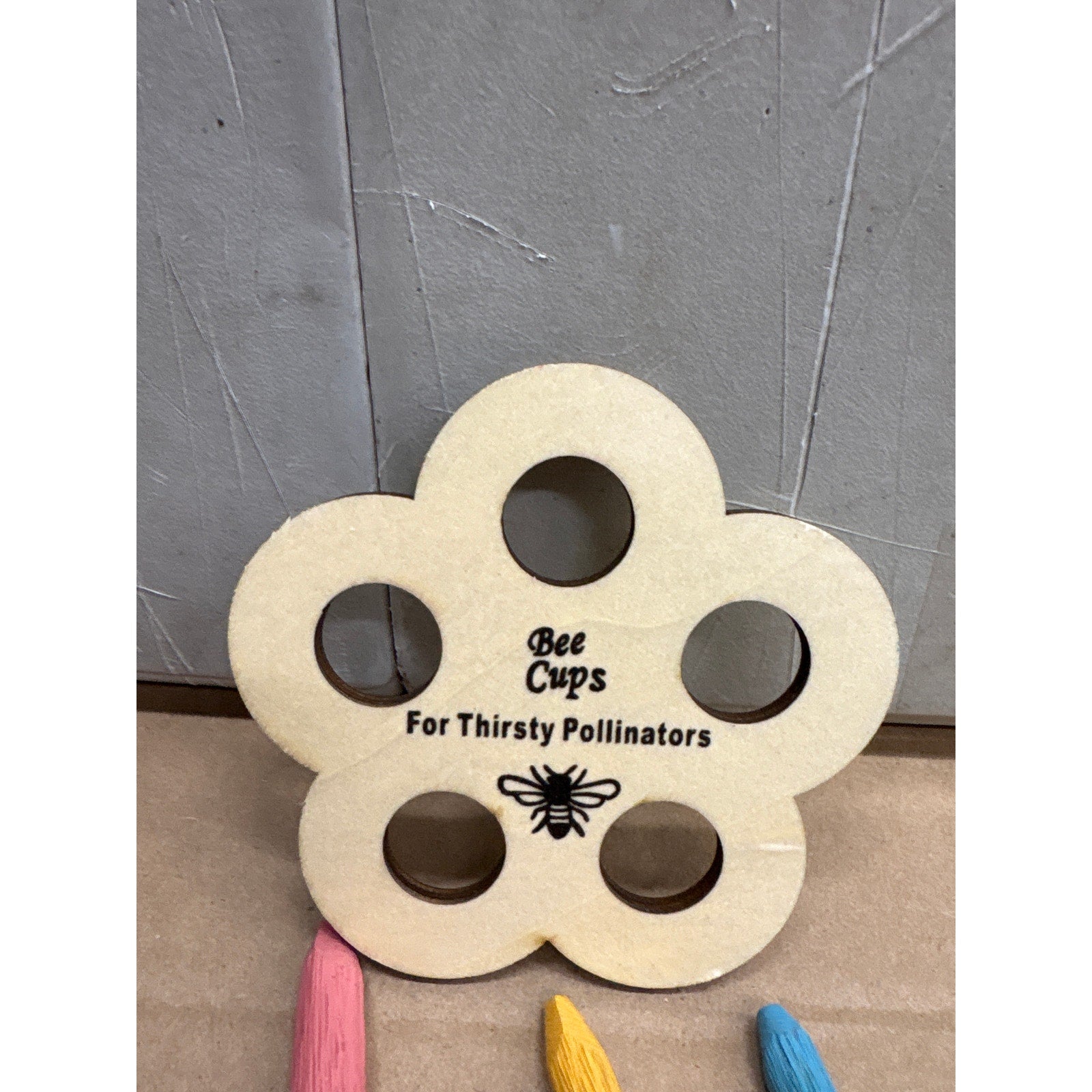 DESIGN: Decorative wooden base with 5 colorful resin cups arranged in a flower pattern, perfect for attracting and feeding bees and other pollinators