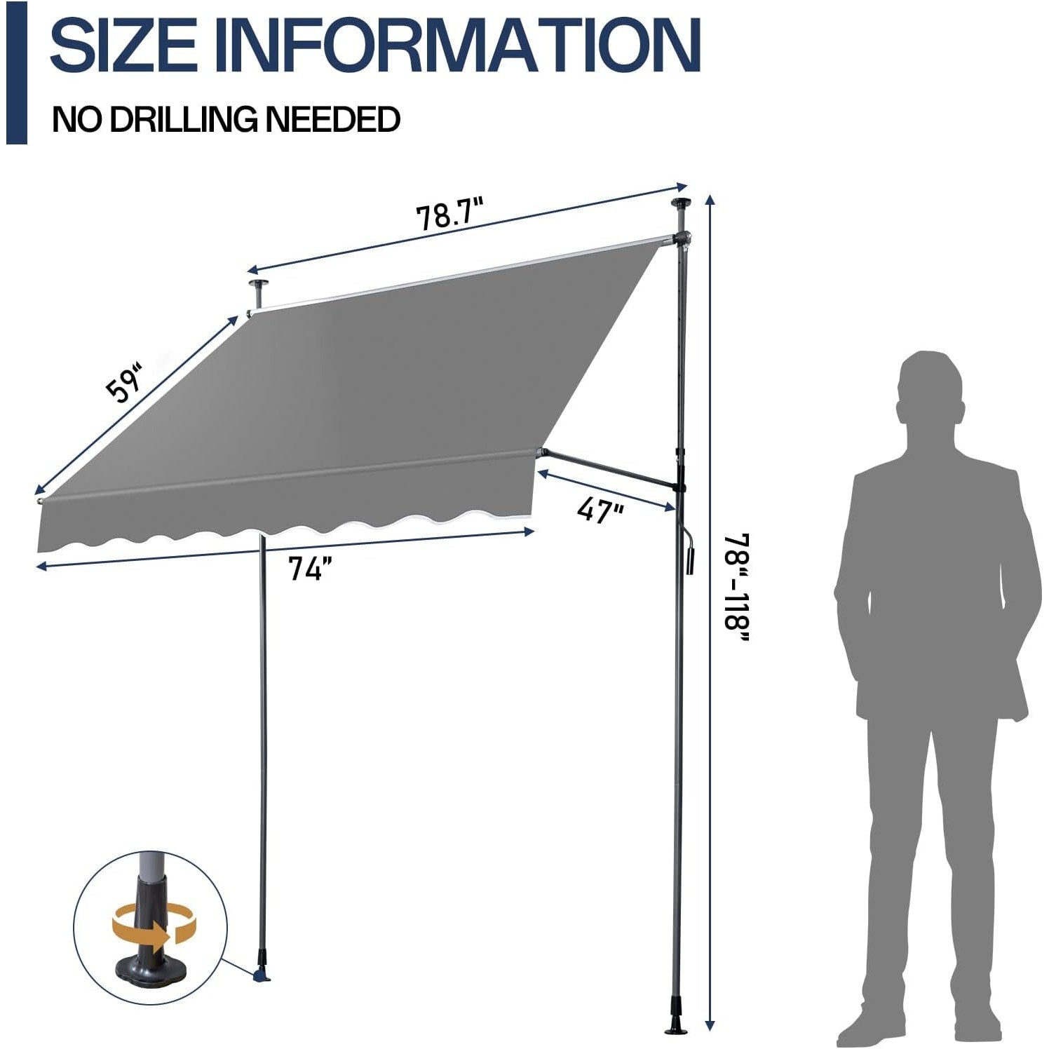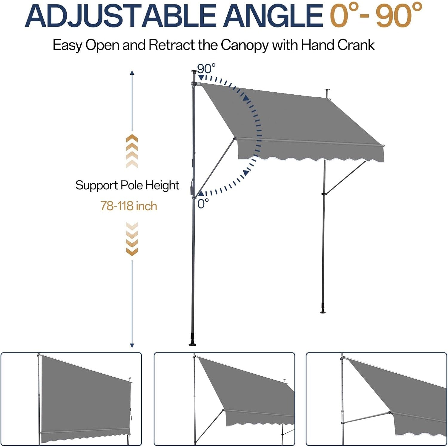 Height & Width Adjustable: Adjustable support poles range from 78" to 118" to fit various doors and windows. The crank handle allows smooth 0–90° angle adjustment for customized shade, with quick and easy extension and retraction.