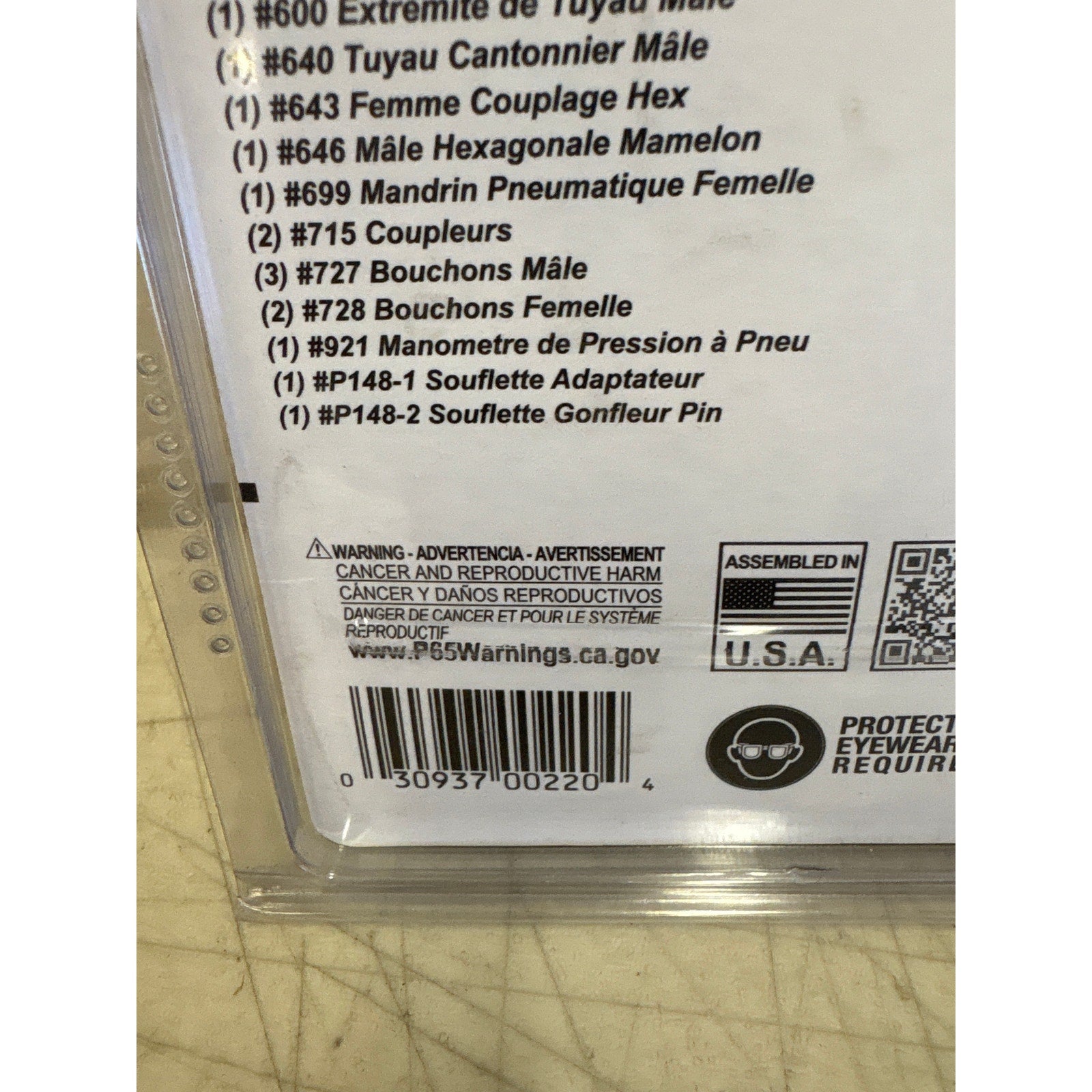 Includes 1 male hose end, male hose mender, female hex coupler, male hex nipple, female air chuck, tire gauge, blow gun adapter and blow gun inflator pin